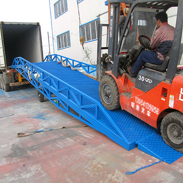 移動登車橋是實(shí)現(xiàn)貨物快速裝卸的專用輔助設(shè)備,它的高度調(diào)節(jié)功能使貨車與庫房的貨臺之間架起一座橋梁,叉車等搬運(yùn)車輛通過它能直接駛?cè)胴涇噧?nèi)部進(jìn)行貨物的批量裝卸,僅需單人作業(yè),即可實(shí)現(xiàn)貨物的快速裝卸。移動液壓登車橋使企業(yè)減少大量勞力,提高工作效率,獲取更大經(jīng)濟(jì)效益。臺面均設(shè)計(jì)為網(wǎng)格狀鋼板,這種結(jié)構(gòu)能保證具有很好的強(qiáng)度,又具有防滑功能,還能方便地清掃工作臺面,使它能經(jīng)常地保持清潔、美觀。移動液壓登車橋無須外接電源,通過手搖泵做動力能輕松地在其整個(gè)調(diào)整范圍內(nèi)按50mm的倍數(shù)進(jìn)行高度的調(diào)整??梢猿浞诌m應(yīng)各種不同高度的貨車.